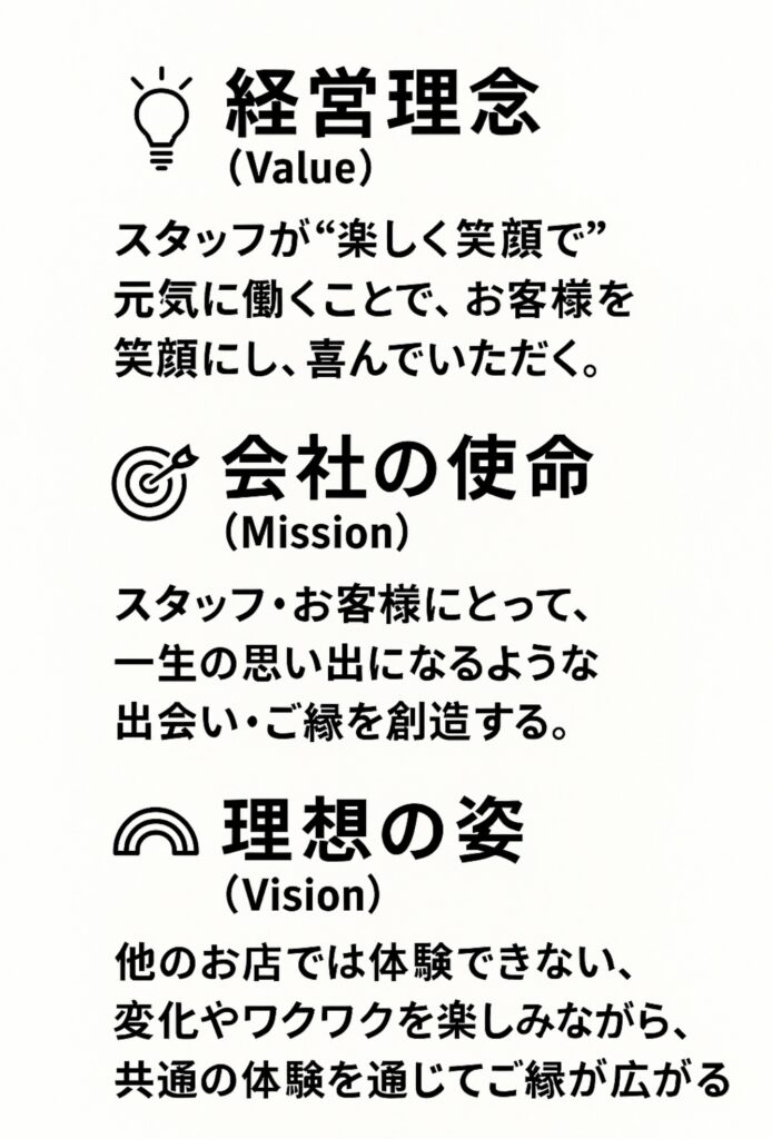 私たちは、スタッフとお客様の双方にとって、一生の思い出に残るような「出会い」と「ご縁」を創り出す会社であり続けます。